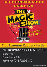 Die grosse Zaubershow des Club Luzerner Zauberkünstler ist eine der ältesten Traditionen des Kleintheaters. Immer am Stephanstag verzaubern die Luzerner Amateurzauberer das Kleintheater und viele kleine und grosse staunende Gäste. Unter dem diesjährigen Motto 'geschichtenerzählende Zauberkunst' führen die Magier gemeinsam mit den Geschichtenerzählern Bernardo und Sigrida aus Deutschland ihre Besucher in das Reich der Fantasie.